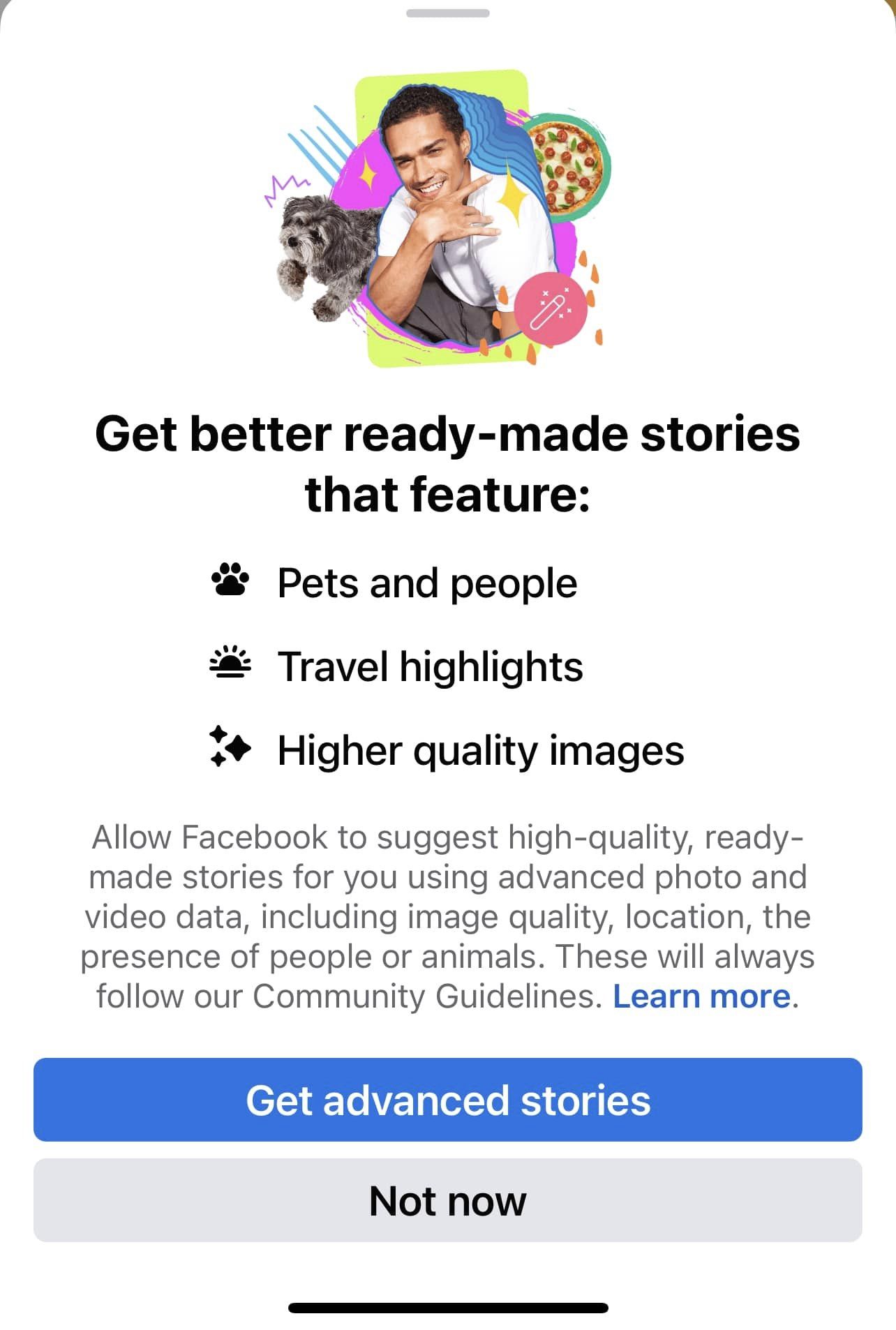 But that’s not all! There are also advanced Facebook AI stories that use machine learning to evaluate the content of your photos, resulting in higher-quality suggestions.