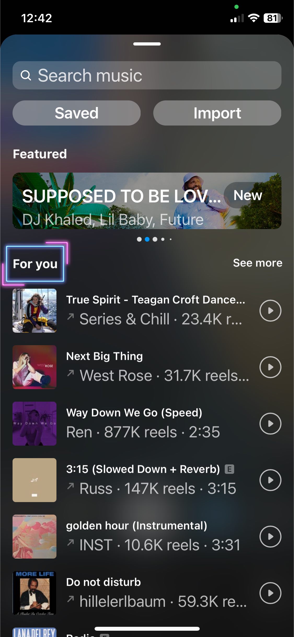While editing your Reel, navigate through the audio library. The “For You” section not only gives personalized recommendations but also showcases trending sounds.
