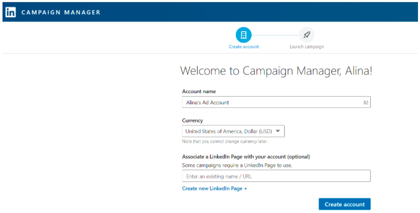You should enter your account name, currency and associate a LinkedIn Page with your account.