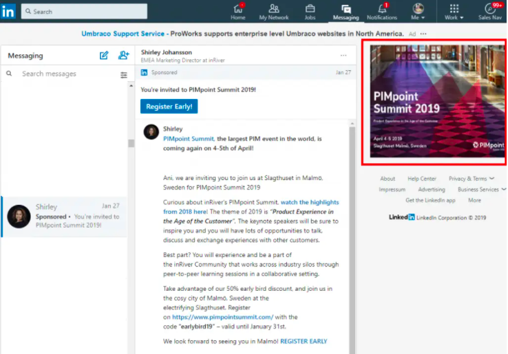 Sponsored InMail (or advertising mail) is an advertising format that involves sending personalized targeted messages to the audience via LinkedIn Messenger. Usually, the advertising message consists of a custom greeting, a call-to-action button, the main text, and a link to the landing page. Make sure to include a visual that resonates with your text add as it is displayed on the image below.