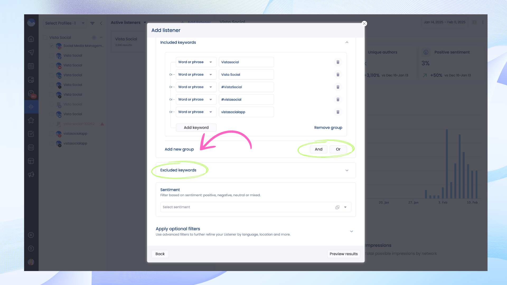 9. You make create word or phase groups and choose whether you want all (And) or any of the keywords (Or) to appear to be pulled through by the Listener. You may also exclude results that contain any keywords that you don’t want by specifying them under Excluded Keywords.