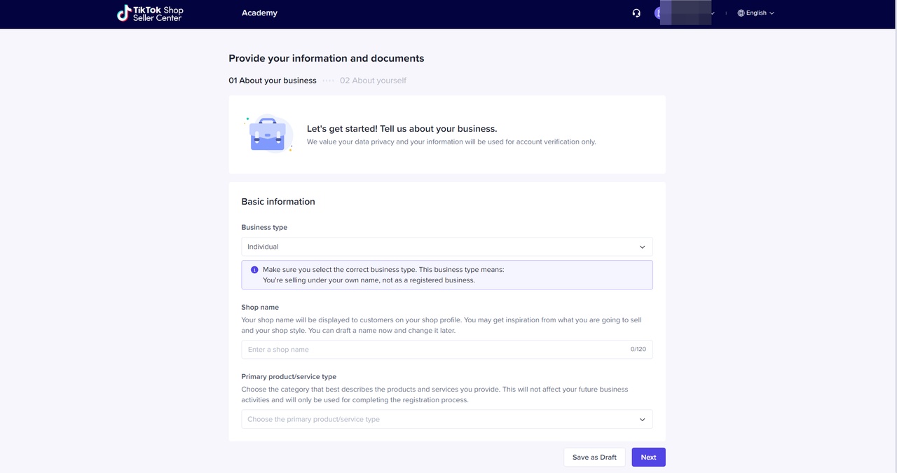 Different account types require different info. You’ll choose a business type, shop name, and product/service type.